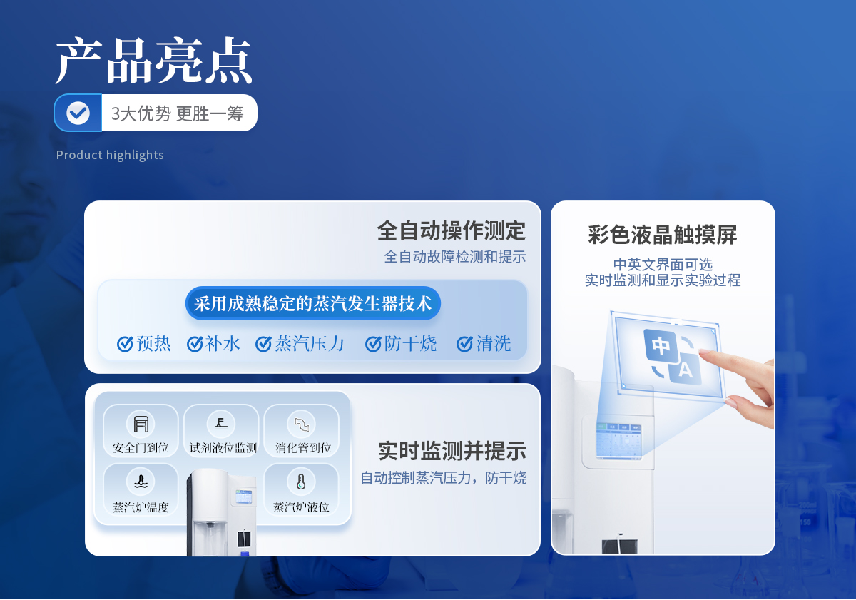 | 1.采用國家標(biāo)準(zhǔn)的凱氏定氮方法:濃硫酸環(huán)境消解樣品、堿性環(huán)境蒸汽蒸餾、硼酸吸收、指示劑滴定終點顏色判斷法。參與國家標(biāo)準(zhǔn)GB/T22923-2008、官方JJF109-2012《定氮儀校準(zhǔn)規(guī)范》的起草; | 2.☆全自動添加試劑、蒸餾、滴定、消解管排廢、滴定缸排廢、校正、液位監(jiān)測、計算、數(shù)據(jù)存儲、生成測試報告并上傳,整個實驗過程全自動化處理簡單**; | 3.全自動安全監(jiān)測:安全門、消化管到位監(jiān)測;蒸餾發(fā)生器具有壓力傳感器、蒸汽過壓保護(hù)、溫度傳感器、溫度保護(hù)開關(guān)、水位浮球與電位雙重檢測等多重保護(hù);蒸餾餾出液溫度和體積監(jiān)測,避免溫度過高或蒸餾體積波動影響測試結(jié)果;冷卻水流量實時監(jiān)測,低水壓報警,停水自動終止運行;冷凝流出液溫度監(jiān)測,保障樣品完全冷凝,確保實驗結(jié)果準(zhǔn)確可靠; | 4.☆可搭配35位自動進(jìn)樣器,實現(xiàn)真正的無人值守,有效降低人員占有率,減少實驗成本; | 5.全新的多核ARM操作系統(tǒng),中英文操作界面可選,10英寸LED高清彩色液晶觸摸屏實時監(jiān)測和顯示實驗過程; | 6.☆四級權(quán)限分級功能,從程序管理員-主管理員-輔助管理員-操作員使用不同權(quán)限,內(nèi)置時間鎖數(shù)據(jù)鎖符合“GLP和GMP”規(guī)定; | 7.上機(jī)采用windows操作軟件,具有測試數(shù)據(jù)、回收率計算及統(tǒng)計、測試報告自動生成等功能,可方便用戶通過PC機(jī)對數(shù)據(jù)進(jìn)行分析、處理; | 8.☆可通過USB2.0接口使用U盤輸出數(shù)據(jù);儀器內(nèi)置WIFI模塊,網(wǎng)絡(luò)自動識別,可通過無線通訊,將詳細(xì)的測試信息同步上傳至PC端處理; | 9.雙蒸餾模式,蒸汽流量0~100%任意可調(diào); | 10.外置滴定杯,實驗過程實時可見,滴定系統(tǒng)照明配置與成熟的顏色終點判定軟件配合,使外界光源的影響降至**; | 11.高精度滴定系統(tǒng),專業(yè)一體式精工柱塞,確保測試精度和使用的可靠性; | 12.☆滴定系統(tǒng)采用動態(tài)滴定技術(shù),自動變速滴定技術(shù),滴定系統(tǒng)自動判斷和切換滴定速度,真正達(dá)到蒸餾、滴定、計算過程同步完成,減少實驗時間40%; | 13.滴定顏色可自動與手動校準(zhǔn)。滴定終點判定采用高精度的十六位三基色數(shù)字信號顏色傳感器采集顏色信號; | 14.儀器內(nèi)部可儲存100萬組數(shù)據(jù)。測試結(jié)果可選擇包含Word、Excel等12種表示方式; | 15.耐強(qiáng)酸耐強(qiáng)堿液腐蝕隔膜試劑泵,超強(qiáng)的耐顆粒堵塞結(jié)構(gòu),加液穩(wěn)定,負(fù)壓抽吸無危險; | 16.☆防濺瓶采用高分子材質(zhì),耐高溫、強(qiáng)堿,同時保證氨氣不泄露,回收率不偏低; | 17.試劑桶液位監(jiān)測,保證實驗過程不出現(xiàn)缺液問題。 | 18.儀器具備自檢功能、具備一鍵重置。 | 19.標(biāo)配2種工作模式根據(jù)需求可增配硝態(tài)氮、高氮自動測試模塊。 | 20.☆304不銹鋼蒸餾反應(yīng)室,特氟龍?zhí)幚砜梢暟踩T。 | 21.貼合氨逸出規(guī)律特殊設(shè)計的蒸餾系統(tǒng),確保高可靠的測試回收率 | 22.儀器內(nèi)置操作助手儀器更智能化。 |