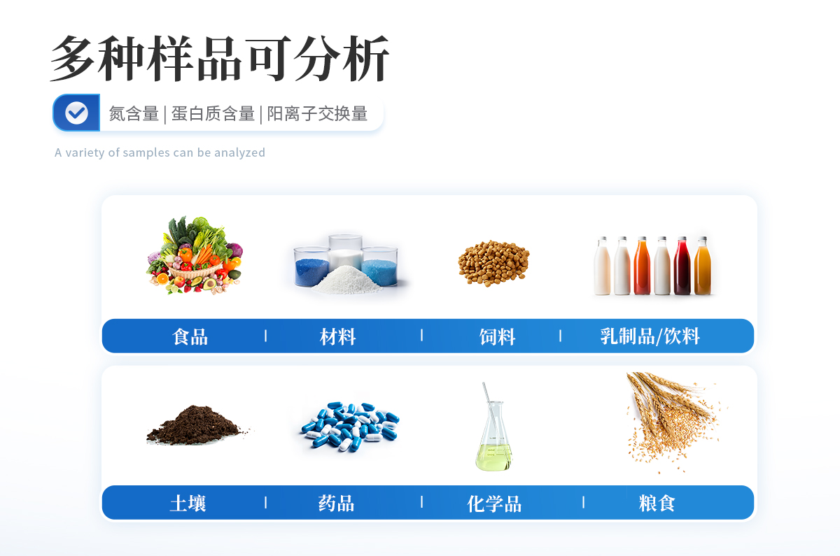 1.廣泛應(yīng)用于食品加工、飼料生產(chǎn)、煙草畜牧、土肥、環(huán)境監(jiān)測、醫(yī)藥、農(nóng)業(yè)、科研、教學(xué)、質(zhì)量監(jiān)督、檢驗檢疫等領(lǐng)域氮含量或蛋白質(zhì)含量測定、陽離子交換量測定。