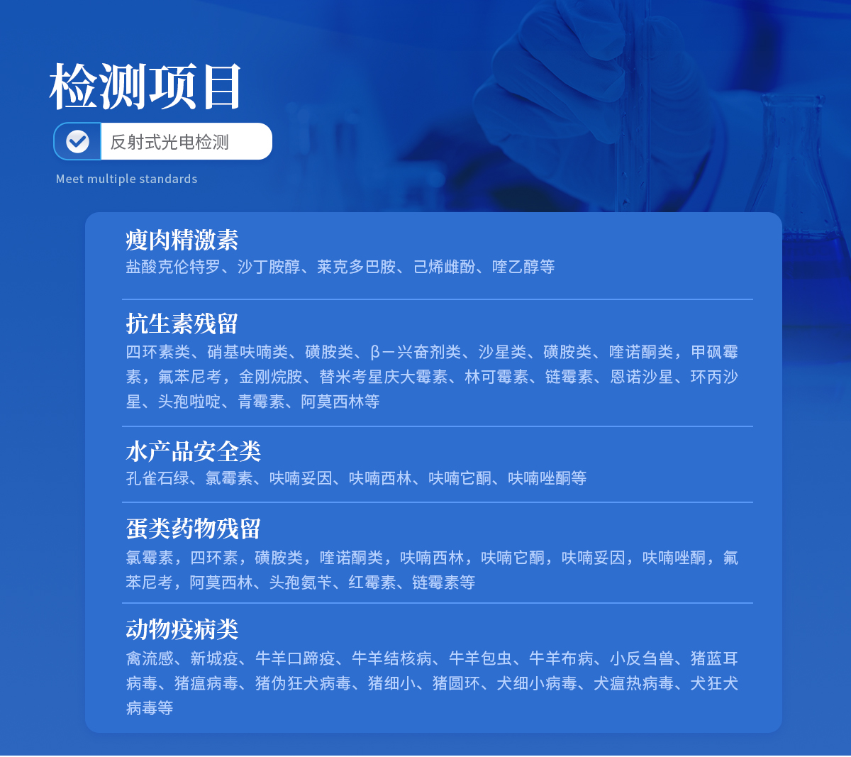 | 1、 瘦肉精激素:鹽酸克倫特羅、沙丁胺醇、萊克多巴胺、己烯雌酚、喹乙醇等 | 2、 抗生素殘留:四環素類、硝基呋喃類、磺胺類、β-興奮劑類、沙星類、磺胺類、喹諾酮類,甲砜霉素,氟苯尼考,金剛烷胺、替米考星、慶大霉素、林可霉素、鏈霉素、恩諾沙星、環丙沙星、頭孢啦啶、青霉素、阿莫西林等 | 3、 水產品安全類:孔雀石綠、氯霉素、呋喃妥因、呋喃西林、呋喃它酮、呋喃唑酮等 | 4、 蛋類藥物殘留 氯霉素,四環素,磺胺類,喹諾酮類,呋喃西林,呋喃它酮,呋喃妥因,呋喃唑酮,氟苯尼考,阿莫西林、頭孢氨芐、紅霉素、鏈霉素等 | 5、 動物疫病類:禽流感、新城疫、牛羊口蹄疫、牛羊結核病、牛羊包蟲、牛羊布病、小反芻獸、豬藍耳病毒、豬瘟病毒、豬偽狂犬病毒、豬細小、豬圓環、犬細小病毒、犬瘟熱病毒、犬狂犬病毒等 |