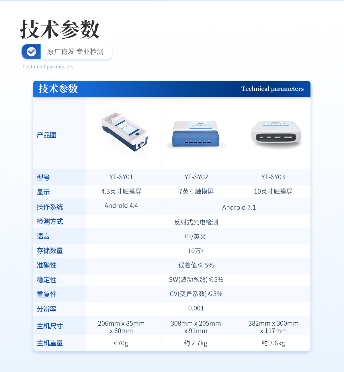 | 1、 7英寸電容式觸摸屏,分辨率:1920:x:1200,內部存儲:1+8GB | 2、 操作系統:Android:7.1 | 3、 檢測方式:反射式光電檢測 | 4、 適配卡殼:70mm*20mm | 5、 語言:中/英文: | 6、 存儲數量:10萬+ | 7、 準確性:誤差值≤:5% | 8、 穩定性:SW(波動系數)≤5% | 9、 重復性:CV(變異系數)≤3% | 10、分辨率:0.001 | 11、檢測通道:6通道檢測 | 12、檢測時間:<5秒(單卡及多聯卡);可對樣本進行膠體金定性> | 13、數據傳輸:WiFi、藍牙、USB、射頻讀卡、外置掃碼模塊(選配) | 14、數據處理:可通過通訊端口進行數據匯總、上傳監管平臺等 | 15、檢測通道孵育檢測一體,溫度范圍::室溫:+5℃:~:60℃ | 16、打印機:熱敏打印機(熱敏打印紙:57*20mm) | 17、接口:USB接口:2個;USB-B接口:1個;LAN接口:1個:;DC電源接口:5.5/2.1mm | 18、電源:輸入:AC100V-240V/1.3A 50Hz;輸出:DC12V/5A | 19、使用環境:溫度:0~50℃;濕度:0~90%: | 20、主機尺寸::308mm*205mm*91mm | 21、主機重量:約:2.7kg |