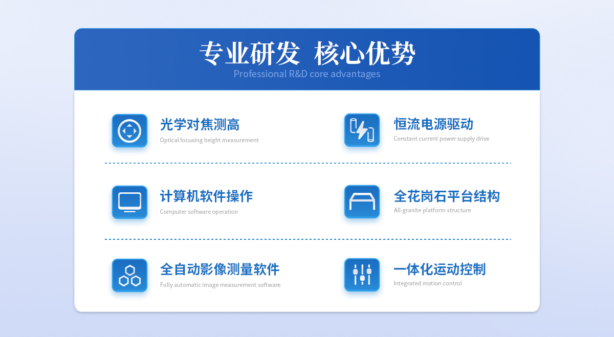 | 儀器基座 精磨高精度高穩(wěn)定性硬質(zhì)鑄鋁 1套 | CCD 700TVL模擬信號(hào)高清彩色CCD(COMST) 1個(gè) | 鏡頭 0.7~4.5 X連續(xù)變焦鏡頭 1個(gè) | 光柵尺 高精度位移傳感電子尺,分辨率:1μm (精微) 2條 | 導(dǎo)軌 咸陽藍(lán)博P級(jí)精密交叉導(dǎo)軌(LB) 3組 | 傳動(dòng) 西德無牙光桿精密傳動(dòng)(西德) 3條 | 表面光源 LED恒流環(huán)形驅(qū)動(dòng)光源 (兩環(huán)一區(qū)) 1個(gè) | 底光源 LED白色恒流底光源 1PCS | 數(shù)據(jù)采集卡 DC3000 1PCS | 視頻采集卡 視頻采集卡 1PCS | 影像測量軟件 DTV 2.5T手動(dòng)影像測量軟件 1套 | 光學(xué)校正片 DTV 定制 1塊 | 電壓 AC :100-240V(全電壓) 1個(gè) |