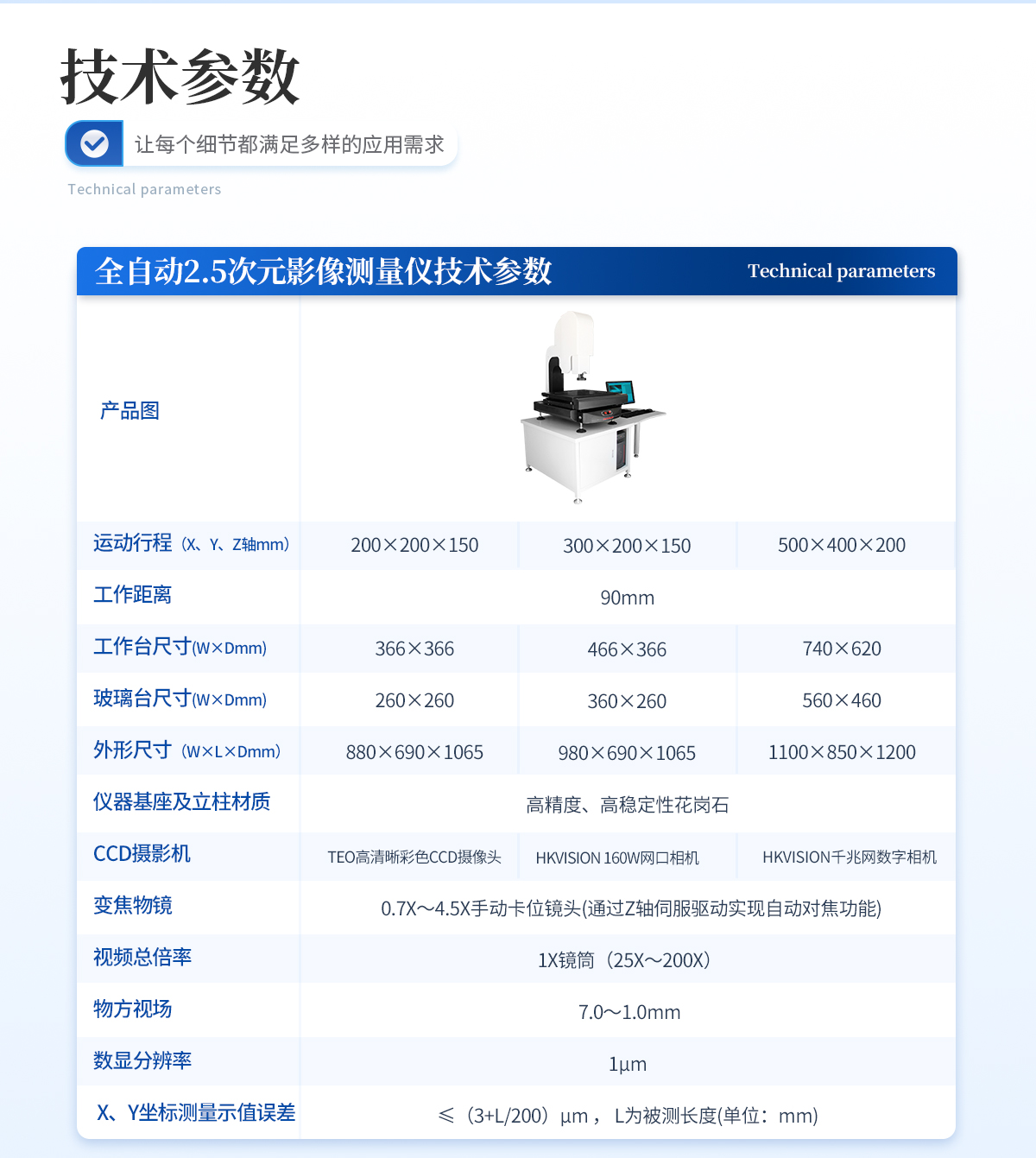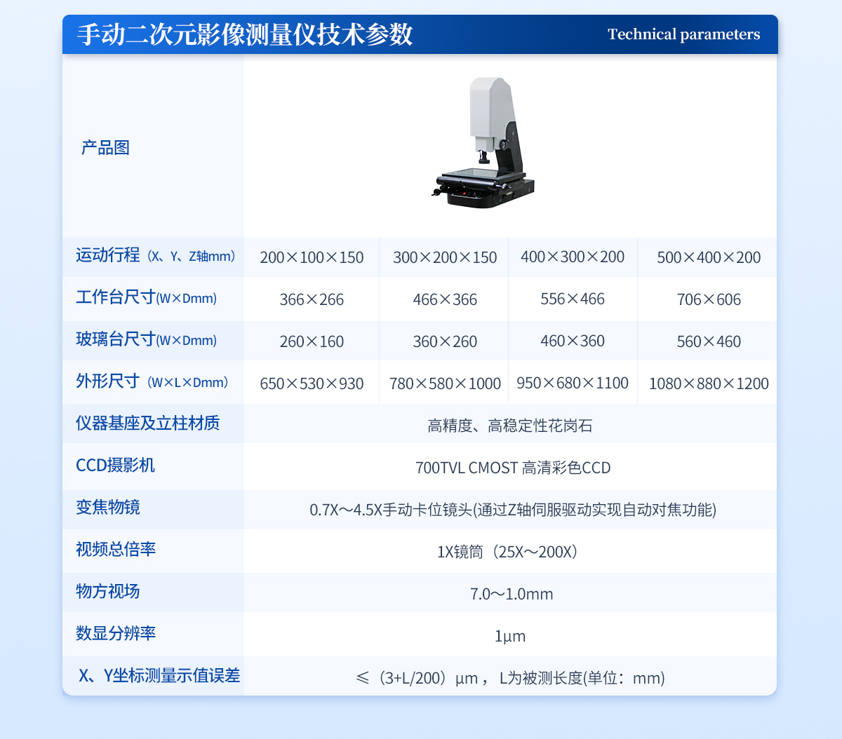 | l 運(yùn)動(dòng)行程(X、Y、Z軸mm):100×100×75 | l 工作臺(tái)呎寸(W×Dmm): 232×232 | l 玻璃臺(tái)呎寸(W×Dmm): 110×110 | l 外形尺寸(W×L×Dmm): 300×450×650 | l 工作距離:90mm | l 儀器材質(zhì): 高精度硬質(zhì)鋁基座+航空鋁工作臺(tái) | l CCD攝影機(jī):COMST 700TVL模擬信號(hào)高清彩色CCD | l 變焦物鏡: 0.7X~4.5X連續(xù)變焦鏡頭 | l 視頻總倍率:1X鏡筒(25X~200X) | l 物方視場: 7.0~1.0mm | l 數(shù)顯分辨率:1μm | l X、Y坐標(biāo)測量示值誤差≤(3+L/200)μm , L為被測長度(單位:mm) | l 操作方式:手動(dòng)移動(dòng)平臺(tái) |