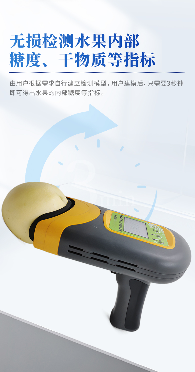 產品描述:儀器介紹:果實內部品質無損檢測儀是一款便攜式的果實質量檢測儀,可以方便的檢測水果內部的糖度、干物質等指標,由用戶根據需求自行建立檢測模型,用戶建模后,只需要3秒鐘即可得出水果的內部糖度等指標。儀器內置可充電鋰電池,單次充滿后可連續檢測2000次,檢測結果實時顯示在設備屏幕上,用戶可以通過數據線將檢測數據上【詳情】  更新時間:2026-03-01