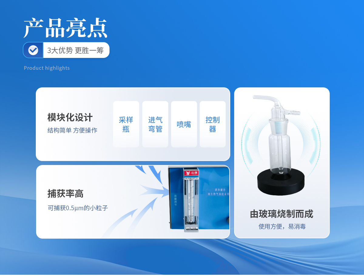 液體沖擊式微生物氣溶膠采樣器 (又稱:液體撞擊式采樣器)是全玻璃制造,由采樣瓶、進氣彎管、噴嘴、控制器組成結構是有一呈90度弧型彎曲的進氣管和一盛采樣液體的外瓶。進氣管上部的彎管,是模擬人的上呼吸道對氣溶膠粒子的阻攔。在管的末端有一微孔噴嘴, 氣流經此速度變快可達聲速,利用噴射氣流將空氣中的微生物粒子采集于液體采樣介質中。由于液體的粘附性,將微生物粒子捕獲。