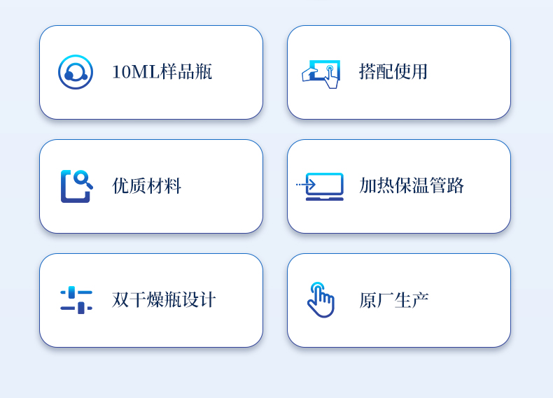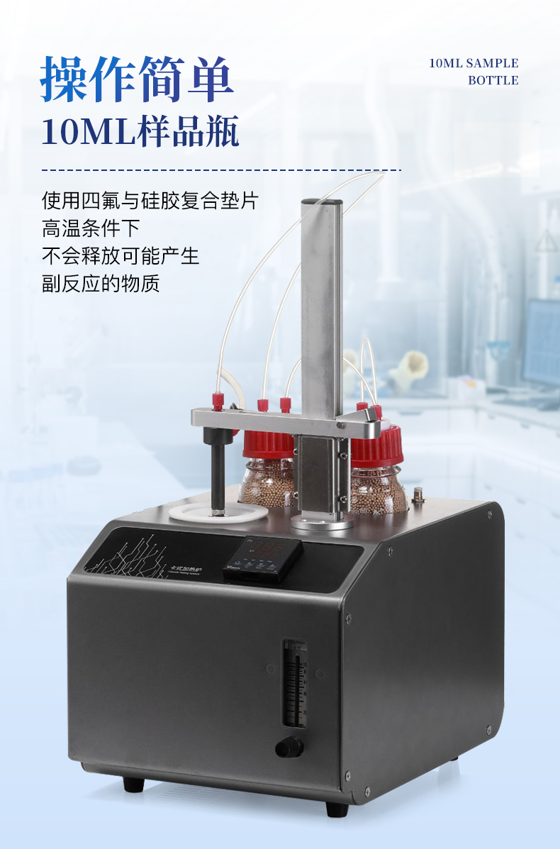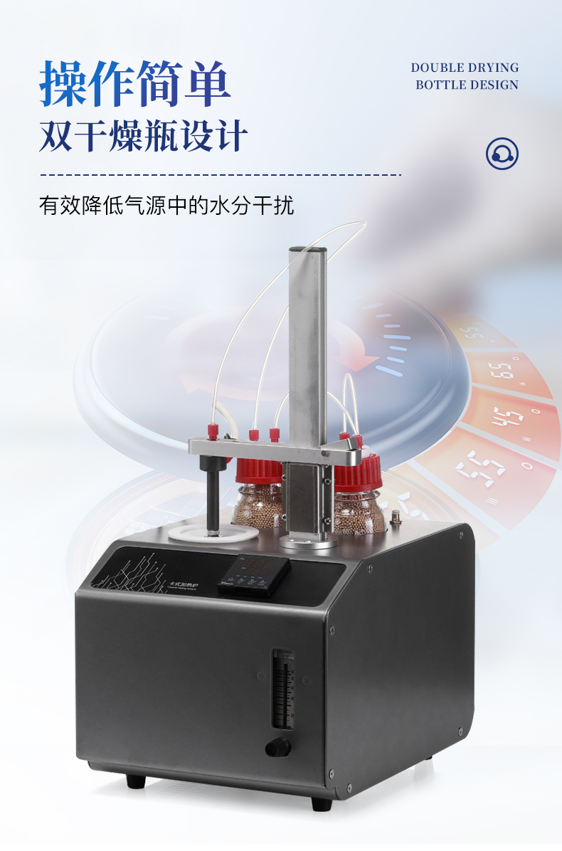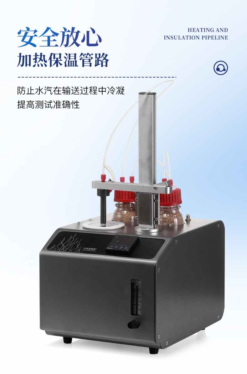 | 1、10ml樣品瓶:使用四氟與硅膠復合墊片,高溫條件下不會釋放可能產生副反應的物質 | 2、雙干燥瓶設計,有效降低氣源中的水分干擾 | 3、加熱保溫管路,防止水汽在輸送過程中冷凝,提高測試準確性 |