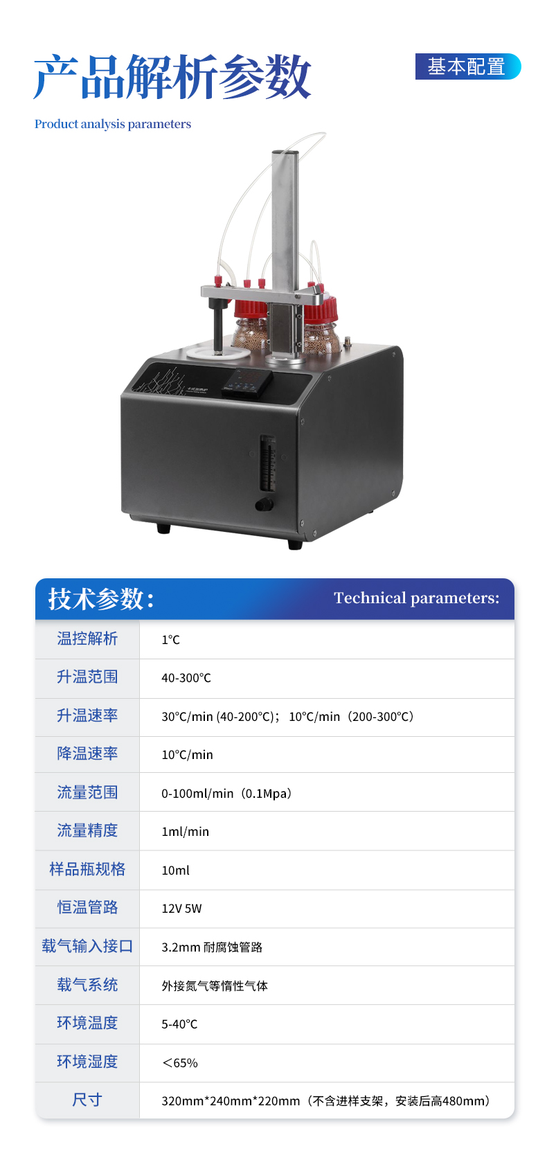 | 型號:YT-KSL | 溫控解析:1℃ | 升溫范圍:40-300℃ | 升溫速率:30℃/min (40-200℃); 10℃/min(200-300℃) | 降溫速率:10℃/min | 流量范圍:0-100ml/min(0.1Mpa) | 流量精度:1ml/min | 樣品瓶規格:10ml | 恒溫管路:12V 5W | 載氣輸入接口:3.2mm 耐腐蝕管路 | 載氣系統:外接氮氣等惰性氣體 | 環境溫度:5-40℃ | 環境濕度:<65% | 尺寸:320mm*240mm*220mm(不含進樣支架,安裝后高480mm) |