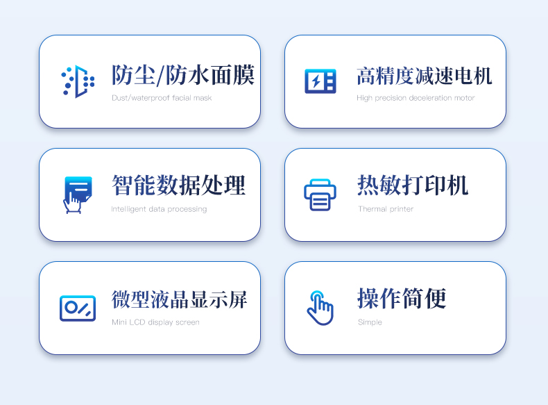 | 防塵、防水面膜、薄膜按鍵和微型液晶顯示屏 | 高精度減速電機及調速器組成的振動部分 | CPU 智能數據處理部分 | 高分辨率熱敏打印機 | 測量結果**小數后4 位 | 儀器結構牢固,外型美觀,操作簡便 |