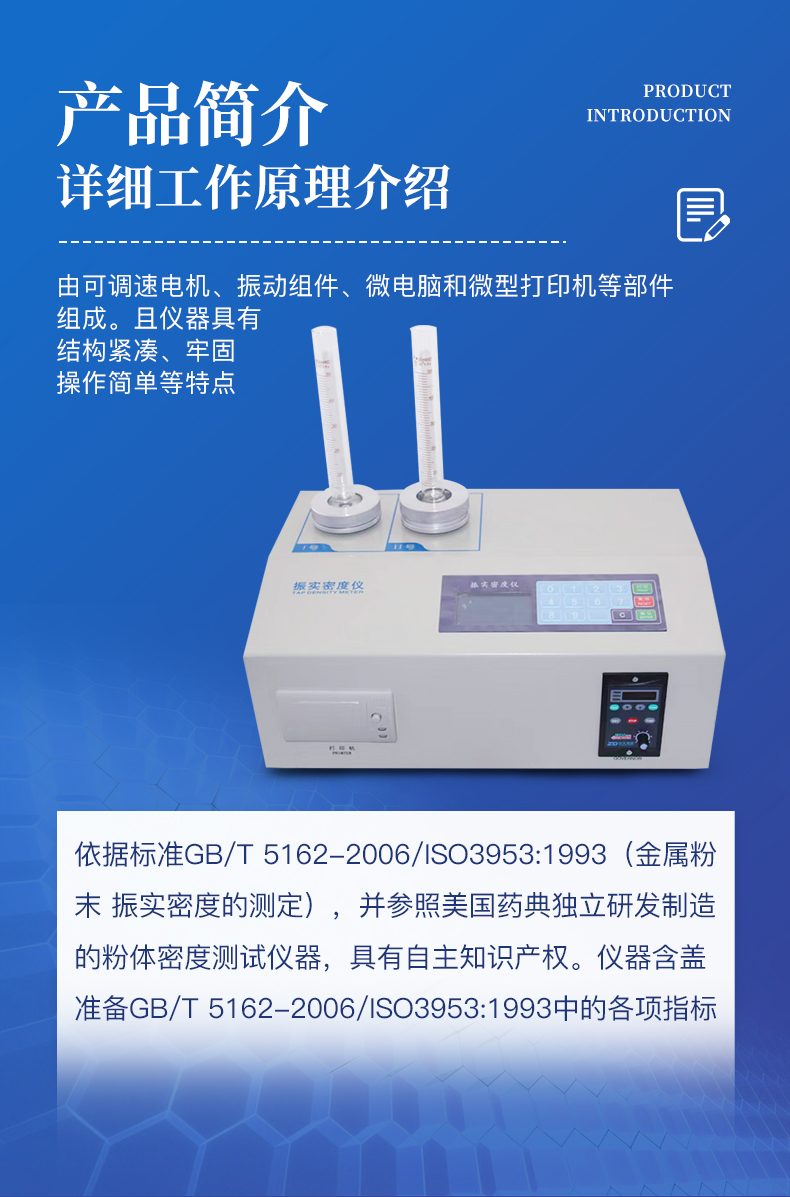 | YT-ZS2型粉體密度測試儀是由丹東市恒瑞儀器有限公司依據標準GB/T 5162-2006/ISO3953:1993(金屬粉末 振實密度的測定),并參照美國藥典獨立研發制造的粉體密度測試儀器,具有自主知識產權。儀器含蓋準備GB/T 5162-2006/ISO3953:1993中的各項指標。 | YT-ZS2型粉體密度測試儀由可調速電機、振動組件、微電腦和微型打印機等部件組成。且儀器具有結構緊湊、牢固,操作簡單等特點。 |
