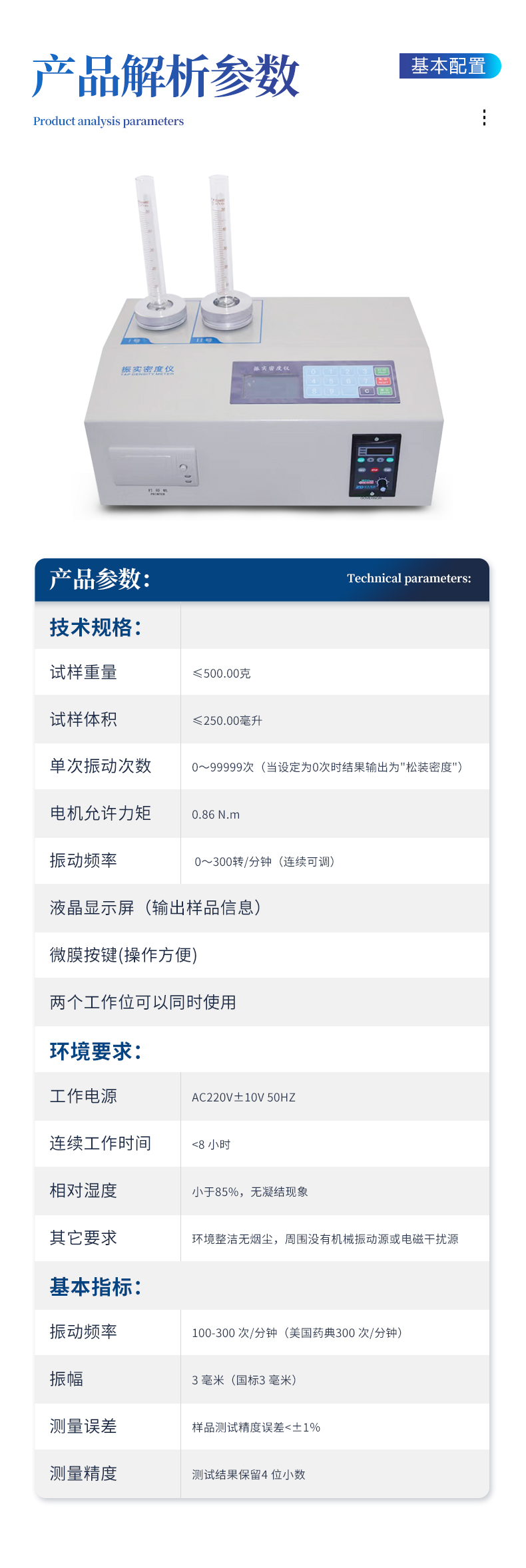 | 試樣重量:≤500.00克; | 試樣體積:≤250.00毫升; | 單次振動次數:0~99999次(當設定為0次時結果輸出為"松裝密度"); | 電機允許力矩:0.86 N.m; | 振動頻率: 0~300轉/分鐘(連續可調); | 液晶顯示屏(輸出樣品信息); | 微膜按鍵(操作方便) | 兩個工作位可以同時使用 | 振動幅度:3mm,(可調) | ZS2高精度振實密度儀是專門針對固體粉體密度的測量儀器,按照國家標準GB/T 5162-2006/ISO3953:1993,參照美國藥典標準研發制造。廣泛應用于工業、電池材料、藥品材料、奶制品、磨料、造紙、水泥、涂料、科研機構、大中專院校以及各種金屬和非金屬行業。 |