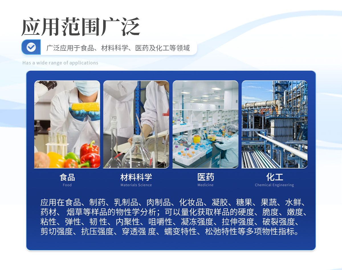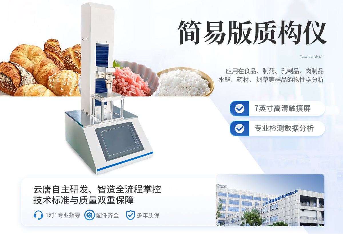 | 操作及控制系統 主機配置7英寸高清觸摸屏,可以直接使用觸摸屏操作質構分析儀,操作簡單,結果顯示 直觀,適用于現場檢測或快速檢測。 | 連接計算機使用,配置專業控制分析軟件,提供豐富的參數設置,進行更為復雜和精細 的測試控制,實時采集測試數據,完成更專業的檢測及數據分析。 | 測試項目及功能 可以應用在食品、制藥、乳制品、肉制品、化妝品、凝膠、糖果、果蔬、水鮮、藥材、煙草等樣品的物性學分析;可以量化獲取樣品的硬度、脆度、嫩度、粘性、彈性、韌 性、內聚性、咀嚼性、凝凍強度、拉伸強度、破裂強度、剪切強度、抗壓強度、穿透強度、蠕變特性、松弛特性等多項物性指標。 | GMP相關要求支持 | 儀器提供分級權限管理:三級別,多用戶。(用戶名+密碼登錄) | 儀器科實現審計追蹤記錄:系統數據自動保存可追溯的測量結果與過程。 | 質構分析儀軟件功能 | 測試方法(任選兩項): | 單壓縮、循環測試、松弛測試、蠕變測試、全質構測試、 拉伸測試、彎曲測試、剪切測試、穿刺測試、凝凍強度測試等。 | 系統開放測試條件參數,支持自定義測試模式。 |