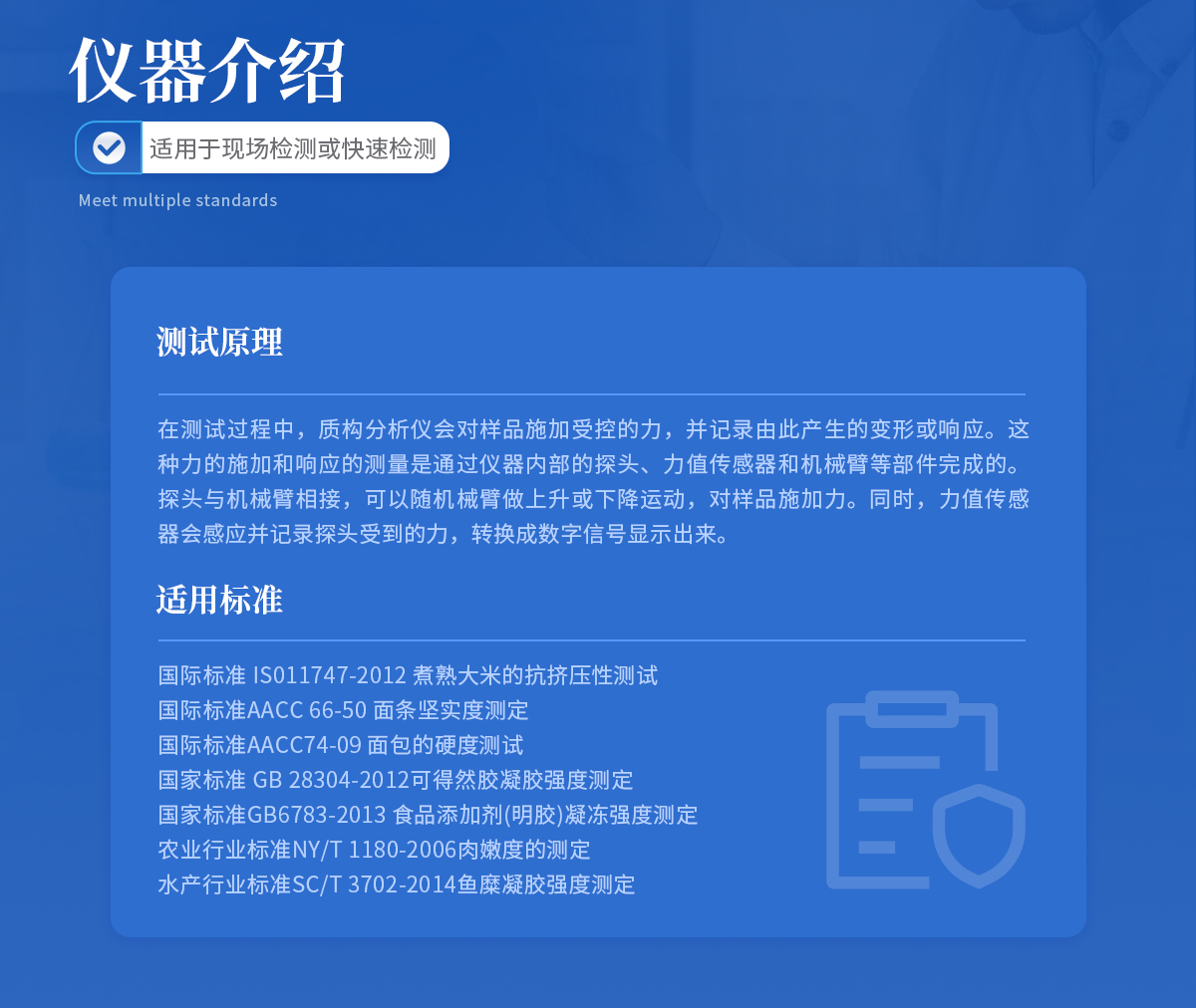 | 國際標準 IS011747-2012 煮熟大米的抗擠壓性測試 | 國際標準AACC 66-50 面條堅實度測定 | 國際標準AACC74-09 面包的硬度測試 | 國家標準 GB 28304-2012可得然膠凝膠強度測定 | 國家標準GB6783-2013 食品添加劑(明膠)凝凍強度測定 | 農業行業標準NY/T 1180-2006肉嫩度的測定 | 水產行業標準SC/T 3702-2014魚糜凝膠強度測定 |