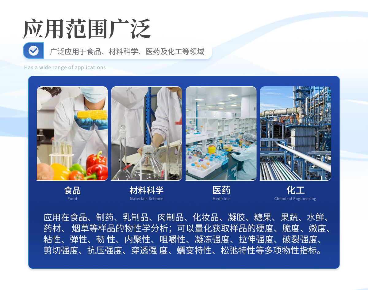 | 操作及控制系統 主機配置7英寸高清觸摸屏,可以直接使用觸摸屏操作質構分析儀,操作簡單,結果顯示 直觀,適用于現場檢測或快速檢測。 | 連接計算機使用,配置專業控制分析軟件,提供豐富的參數設置,進行更為復雜和精細 的測試控制,實時采集測試數據,完成更專業的檢測及數據分析。 | 測試項目及功能 可以應用在食品、制藥、乳制品、肉制品、化妝品、凝膠、糖果、果蔬、水鮮、藥材、 煙草等樣品的物性學分析;可以量化獲取樣品的硬度、脆度、嫩度、粘性、彈性、韌 性、內聚性、咀嚼性、凝凍強度、拉伸強度、破裂強度、剪切強度、抗壓強度、穿透強 度、蠕變特性、松弛特性等多項物性指標。 | GMP相關要求支持 | 儀器提供分級權限管理:三級別,多用戶。(用戶名+密碼登錄) | 儀器科實現審計追蹤記錄:系統數據自動保存可追溯的測量結果與過程。 | 質構分析儀軟件功能 軟件提供十種以上測試方法:單壓縮、循環測試、松弛測試、蠕變測試、全質構測試、 拉伸測試、彎曲測試、剪切測試、穿刺測試、凝凍強度測試等。系統開放測試條件參數,支持自定義測試模式。 |