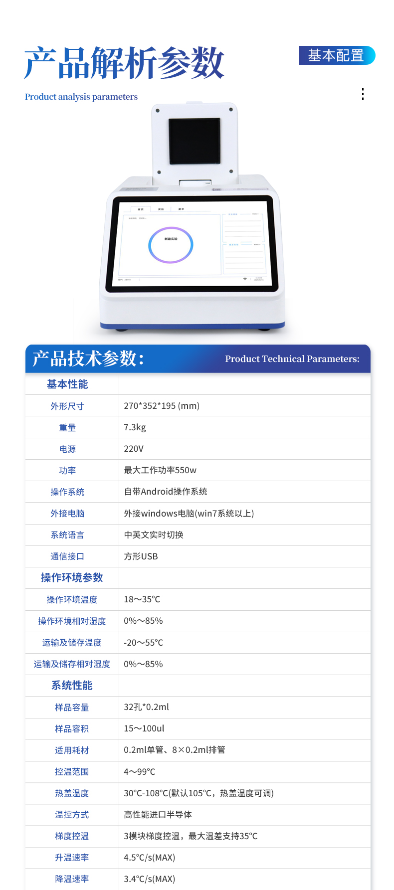 基本性能外形尺寸:270*352*195 (mm)重量:7.3kg電源:220V功率:**工作功率550w操作系統(tǒng):自帶Android操作系統(tǒng)外接電腦:外接windows電腦(win7系統(tǒng)以上)系統(tǒng)語言:中英文實時切換通信接口:方形USB操作環(huán)境參數(shù)操作環(huán)境溫度:18~35℃操作環(huán)境相對濕度:0%~85%運輸及儲存溫度:-20~55℃運輸及儲存相對濕度:0%~85%系統(tǒng)性能樣品容量:32孔*0.2ml樣品容積:15~100ul適用耗材:0.2ml單管、8×0.2ml排管控溫范圍:4~99℃熱蓋溫度:30℃-108℃(默認105℃,熱蓋溫度可調(diào))溫控方式:高性能進口半導體梯度控溫:3模塊梯度控溫,**溫差支持35℃升溫速率:4.5℃/s(MAX)降溫速率:3.4℃/s(MAX)控溫精度:±0.1℃溫度均一性 :±0.25℃溫度準確度:±0.1℃操作功能:預設項目和分析參數(shù),操作簡單方便報告:支持報告自定義模塊,32孔分項目打印分析功能:具多重qPCR數(shù)據(jù)分析功能,可同時檢測4個檢測通道斷電保護:可以一鍵重啟中斷的實驗儀器信息:擁有故障記錄,分析,提示的功能,更方便遠程解決問題分析算法:擴增曲線,標準曲線定量、熔解曲線,基因分型(SNP),相對定量支持HRM檢測:支持數(shù)據(jù)導出:可將實驗結(jié)果以圖形和表格的形式直接導出;詳細的數(shù)據(jù)報告內(nèi)容包括實驗條件,數(shù)據(jù)坐標和表格,數(shù)據(jù)分析參數(shù)。數(shù)據(jù)格式:XLS, CSV, DOCX,PDFTouchDown功能:支持時間和溫度遞增遞減模式熒光檢測系統(tǒng)性能檢測靈敏度:可檢測單拷貝基因動態(tài)范圍:1~10^10熒光重復性:CV<1%(使用某品牌試劑做32孔均一性實驗,32個孔的ct差值保持在0.5以內(nèi),cv保持在1%以內(nèi)。)<>相關(guān)系數(shù):0.99~1(每種濃度3個重復,梯度曲線的相關(guān)系數(shù)>0.99,擴增效率保持在99%~101%之間)擴增效率:99%~101%可信度:區(qū)分1000與2000拷貝濃度差異激光光源:大功率LED(免維護,壽命長)檢測器:高靈敏度光電傳感器激發(fā)和檢測傳播介質(zhì):耐高溫專業(yè)導光光纖激發(fā)光波長 :460nm~480nm , 525nm~545nm, 575nm~595nm ,600nm~620nm檢測光波長 :505nm~525nm , 555nm~575nm , 600nm~620nm , 660nm~680nm