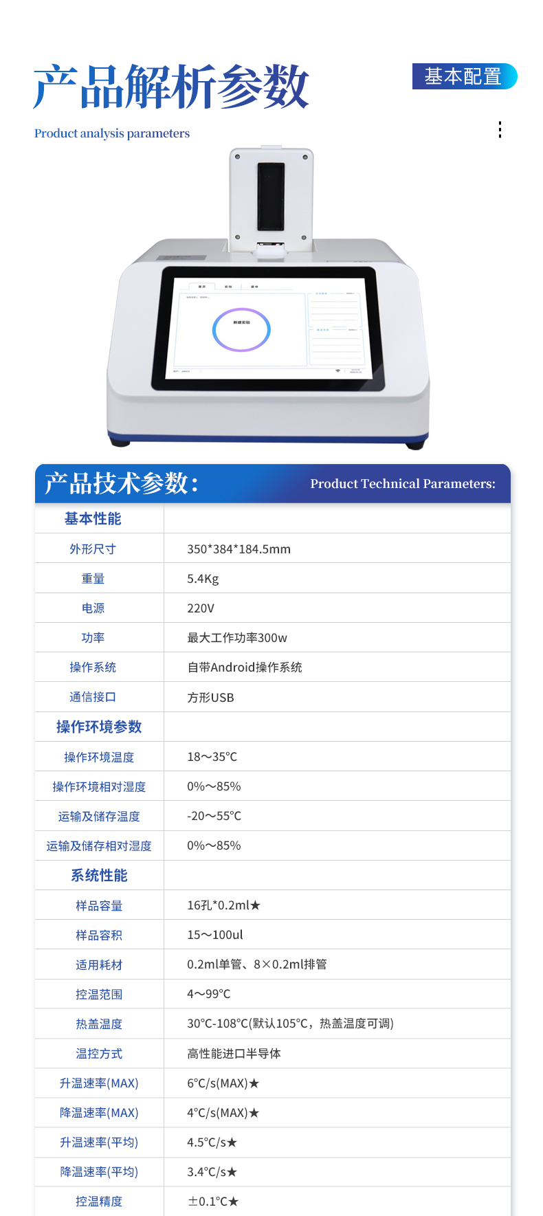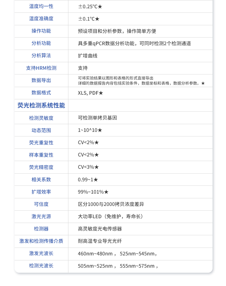 基本性能外形尺寸:350*384*184.5mm重量:5.4Kg電源:220V功率:**工作功率300w操作系統(tǒng):自帶Android操作系統(tǒng)通信接口:方形USB操作環(huán)境參數(shù)操作環(huán)境溫度:18~35℃操作環(huán)境相對(duì)濕度:0%~85%運(yùn)輸及儲(chǔ)存溫度:-20~55℃運(yùn)輸及儲(chǔ)存相對(duì)濕度:0%~85%系統(tǒng)性能樣品容量:16孔*0.2ml★樣品容積:15~100ul適用耗材:0.2ml單管、8×0.2ml排管★控溫范圍:4~99℃熱蓋溫度:30℃-108℃(默認(rèn)105℃,熱蓋溫度可調(diào))溫控方式:高性能進(jìn)口半導(dǎo)體升溫速率(MAX): 6℃/s(MAX)★降溫速率(MAX): 4℃/s(MAX)★升溫速率(平均) :4.5℃/s★降溫速率(平均) :3.4℃/s★控溫精度:±0.1℃★溫度均一性:±0.25℃★溫度準(zhǔn)確度:±0.1℃★操作功能:預(yù)設(shè)項(xiàng)目和分析參數(shù),操作簡(jiǎn)單方便分析功能:具多重qPCR數(shù)據(jù)分析功能,可同時(shí)檢測(cè)2個(gè)檢測(cè)通道分析算法:擴(kuò)增曲線支持HRM檢測(cè):支持數(shù)據(jù)導(dǎo)出:可將實(shí)驗(yàn)結(jié)果以圖形和表格的形式直接導(dǎo)出;詳細(xì)的數(shù)據(jù)報(bào)告內(nèi)容包括實(shí)驗(yàn)條件,數(shù)據(jù)坐標(biāo)和表格,數(shù)據(jù)分析參數(shù)。★數(shù)據(jù)格式:XLS, PDF★熒光檢測(cè)系統(tǒng)性能檢測(cè)靈敏度:可檢測(cè)單拷貝基因動(dòng)態(tài)范圍:1~10^10★熒光重復(fù)性:CV<2%★<>樣本重復(fù)性:CV<2%★<>熒光精密度:CV<3%★<>相關(guān)系數(shù):0.99~1★擴(kuò)增效率:99%~101%★可信度:區(qū)分1000與2000拷貝濃度差異激光光源:大功率LED(免維護(hù),壽命長(zhǎng))檢測(cè)器:高靈敏度光電傳感器激發(fā)和檢測(cè)傳播介質(zhì):耐高溫專業(yè)導(dǎo)光光纖激發(fā)光波長(zhǎng):460nm~480nm , 525nm~545nm,檢測(cè)光波長(zhǎng):505nm~525nm , 555nm~575nm ,