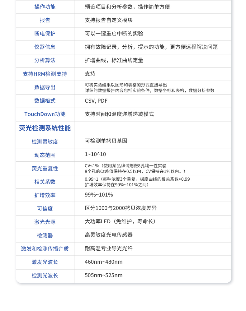 基本性能外形尺寸:320*314*206 (mm)重量:4.2kg電源:220V功率:**工作功率550w操作系統:自帶Android操作系統系統語言:中英文實時切換操作環境參數操作環境溫度:18~35℃操作環境相對濕度:0%~85%運輸及儲存溫度:-20~55℃運輸及儲存相對濕度:0%~85%系統性能樣品容量:8孔*0.2ml樣品容積:15~100ul適用耗材:0.2ml單管、8×0.2ml排管控溫范圍:4~99℃熱蓋溫度:30℃-108℃(默認105℃,熱蓋溫度可調)溫控方式:高性能進口半導體升溫速率:5.5℃/s(MAX)降溫速率:5℃/s(MAX)控溫精度:±0.1℃溫度均一性 :±0.25℃溫度準確度 :±0.1℃操作功能:預設項目和分析參數,操作簡單方便報告:支持報告自定義模塊斷電保護:可以一鍵重啟中斷的實驗儀器信息:擁有故障記錄,分析,提示的功能,更方便遠程解決問題分析算法:擴增曲線,標準曲線定量支持HRM檢測:支持數據導出:可將實驗結果以圖形和表格的形式直接導出;詳細的數據報告內容包括實驗條件,數據坐標和表格,數據分析參數。數據格式:CSV, PDFTouchDown功能:支持時間和溫度遞增遞減模式熒光檢測系統性能檢測靈敏度:可檢測單拷貝基因動態范圍:1~10^10熒光重復性 :CV<1%(使用某品牌試劑做8孔均一性實驗,8個孔的ct差值保持在0.5以內,cv保持在1%以內。)<>相關系數:0.99~1(每種濃度3個重復,梯度曲線的相關系數>0.99,擴增效率保持在99%~101%之間)擴增效率:99%~101%可信度:區分1000與2000拷貝濃度差異激光光源:大功率LED(免維護,壽命長)檢測器:高靈敏度光電傳感器激發和檢測傳播介質:耐高溫專業導光光纖激發光波長: 460nm~480nm檢測光波長 :505nm~525nm
