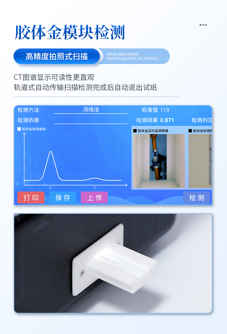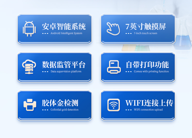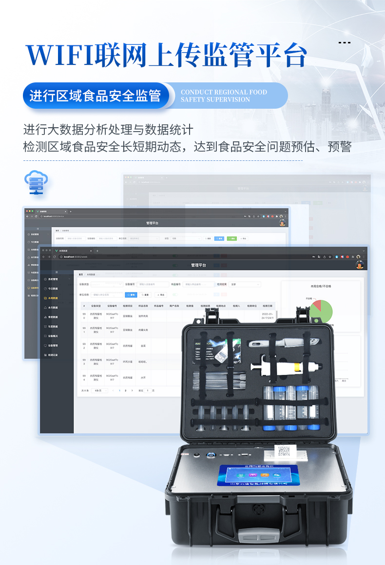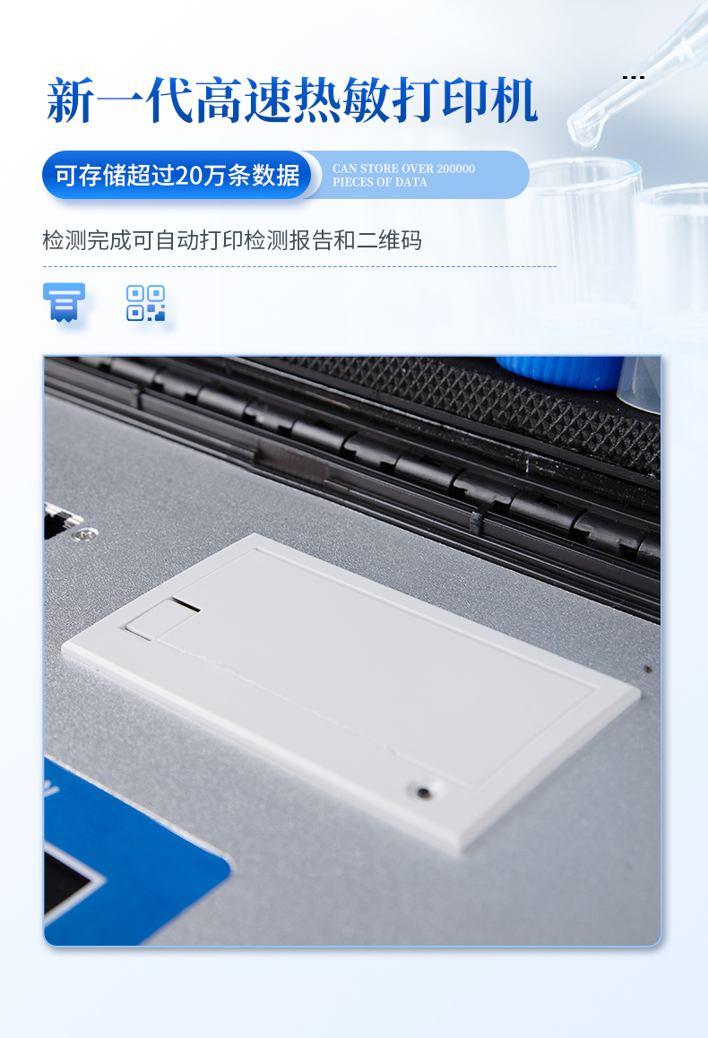| 機箱采用工業級ABS工程塑料箱,方便攜帶,穩固耐用,便于流動測試。 | 安卓智能操作系統,采用更加**和人性化操作,儀器具有網線連接、wifi聯網上傳、4G無線遠傳功能,快速上傳數據。 | 智能化程度高,儀器具有自檢功能:具有開機自檢和調零功能,具有自動檢測重復性功能。 | 新一代高速熱敏打印機,檢測完成可自動打印檢測報告和二維碼。 | 儀器帶有監管平臺,數據可局域網和互聯網數據上傳,檢測結果直接傳至食品安全監管平臺。進行區域食品安全監管及大數據分析處理與數據統計,檢測區域食品安全長短期動態,達到食品安全問題預估、預警 | 一體化主機,包含食品安全檢測模塊、多通道農藥殘留檢測模塊、膠體金免疫層析檢測模塊。 | 一體化便攜式快檢設備,滿足現場及流動檢測使用需求,能夠在同一軟件下實現所有檢測項目的檢測,并可通過同一窗口直觀顯示檢測結果。 | CT線自動識別,無需手動調整。 | 儀器具有品類多種類樣品菜單庫,可靈活選擇檢測樣品,不同的檢測通道可同時檢測不同的樣品項目。 | 樣品處理簡單省力,整體操作快速、安全、便捷。 | 儀器具有自身保護功能,可設置用戶名及密碼,防止非工作人員操作等。 | 高靈敏度,高檢測精度,高重復性精度,掃描式高精度光學傳感器。 | 內置強大的數據庫,可在儀器上直接選擇樣品名稱、檢測指標、送檢單位等信息,也可在儀器上直接編輯錄入樣品名稱、檢測指標、送檢單位等信息并保存進樣品數據庫。 | 儀器具有重新校準、鎖定、恢復出廠設置功能。 | 支持U盤存儲。 結果判定線可修改,對照值標定值可保存,斷電不丟失數據 | 兼容市場上所有的膠體金卡,使用耗材不受限制,極大增強用戶使用體驗。 |