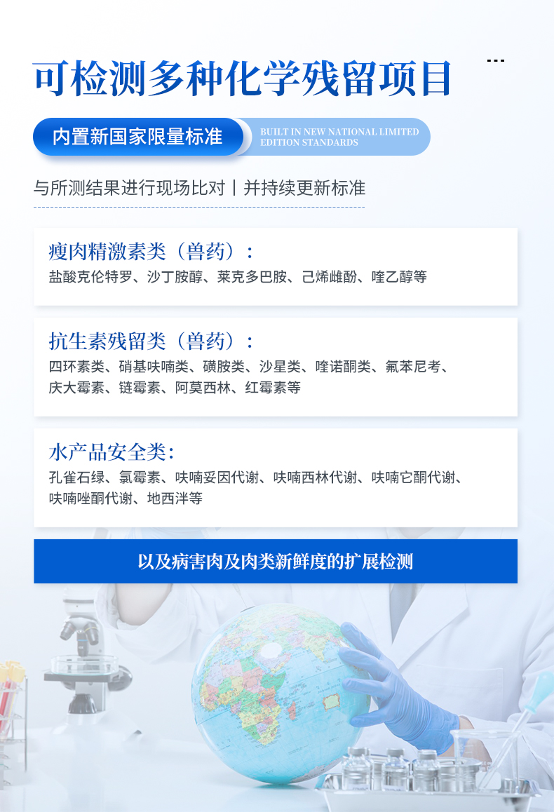 抗生素殘留檢測儀可現場快速檢測抗生素類殘留、獸藥殘留、激素類殘留、毒素類殘留,化學類殘留等多種項目,如可快速檢測四環素類、硝基呋喃類、磺胺類、沙星類、喹諾酮類、氯霉素、慶大霉素、鏈霉素、喹乙醇代謝物、硫酸鏈霉素、羧芐青霉素、噻孢菌素鈉、阿莫西林、氨芐西林、紅霉素、潮霉素B、安普霉紊、桿菌肽等抗生素快速檢測;還可檢測激素類:鹽酸克倫特羅、沙丁胺醇、萊克多巴胺、己烯雌酚等,水產獸藥:呋喃妥因代謝、呋喃西林代謝、呋喃它酮代謝、呋喃唑酮代謝、孔雀石綠等,毒素類:黃曲酶毒素B1、嘔吐毒素、玉米赤霉烯酮、赭曲霉毒素A等,化學類藥物:氨丙琳、甲基吡啶磷、阿滅丁、雙甲脒、阿散酸、阿維菌素、氮哌酮、芐青霉家、頭孢噻呋、克拉維酸、氯羥吡啶等。