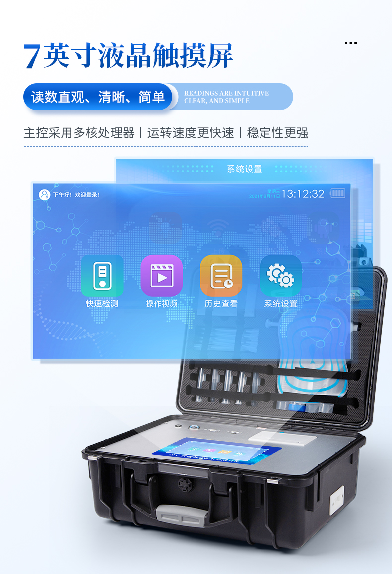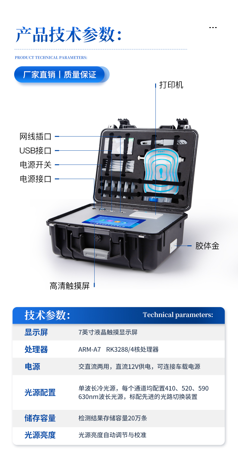 | 主控芯片采用ARM Cortex-A7,RK3288/4核處理器,主頻1.88Ghz,運轉速度更快速,穩定性更強。 | 顯示方式:7英寸液晶觸摸屏顯示,人性化中文操作界面,讀數直觀、簡單。 | 交直流兩用,直流12V供電,可連接車載電源,可配6ah大容量充電鋰電池,方便戶外流動測試。 | 光源亮度自動調節與校準 | 智能恒流穩壓,光強自動校準,長時間連續工作光源無溫漂現象。 | 內置新國家限量標準,與所測結果進行現場比對,并持續更新標準。 | 不間斷進樣,連續檢測 | 樣本編號自動累加。 | 檢測項目可擴充。 | 檢測結果可批量打印,批量上傳。 | 檢測結果為Excel表格,連接電腦即可拷貝 | 檢測結果存儲容量20萬條 | 標準USB接口,免驅動安裝。 | 固件可升級 |