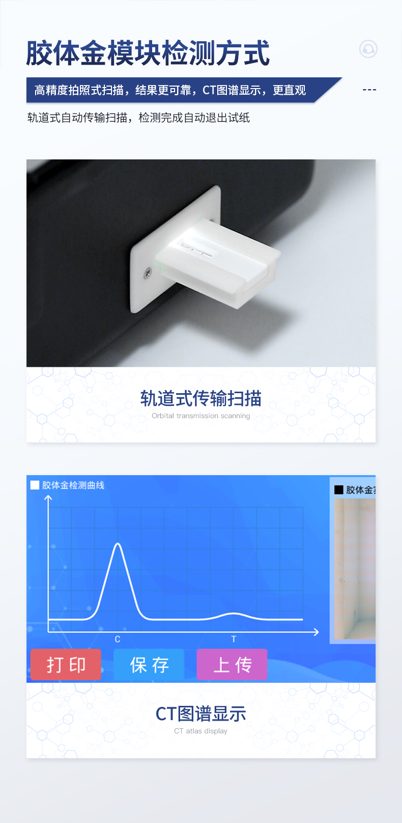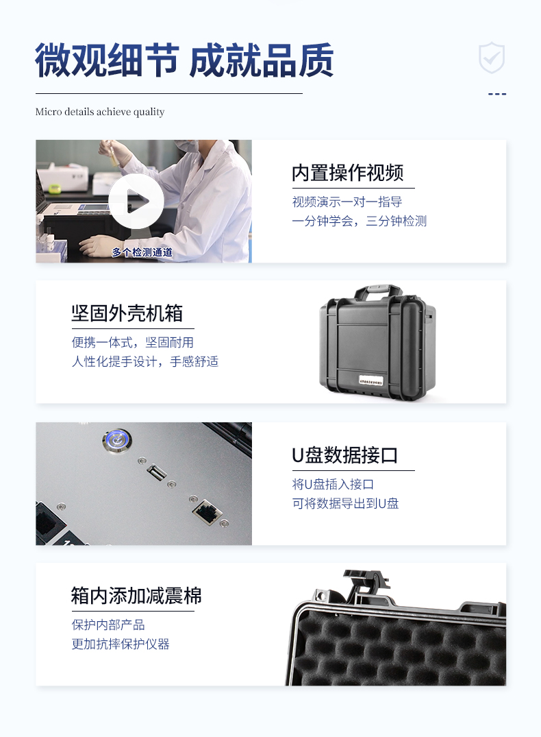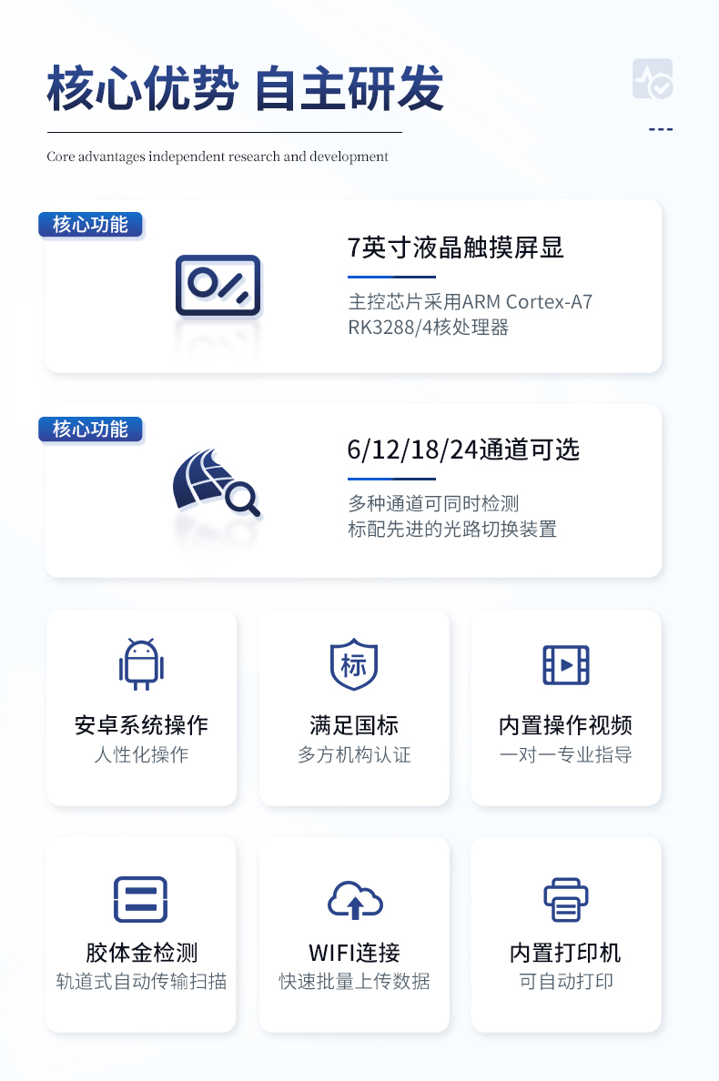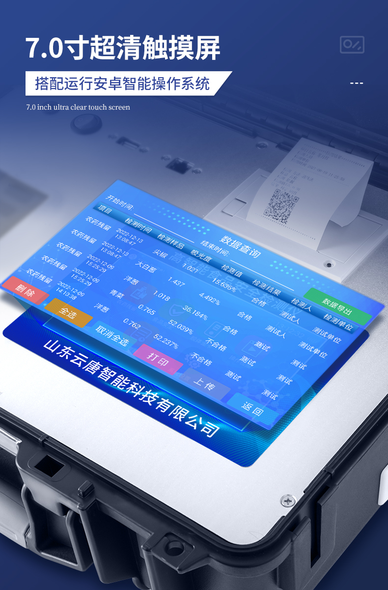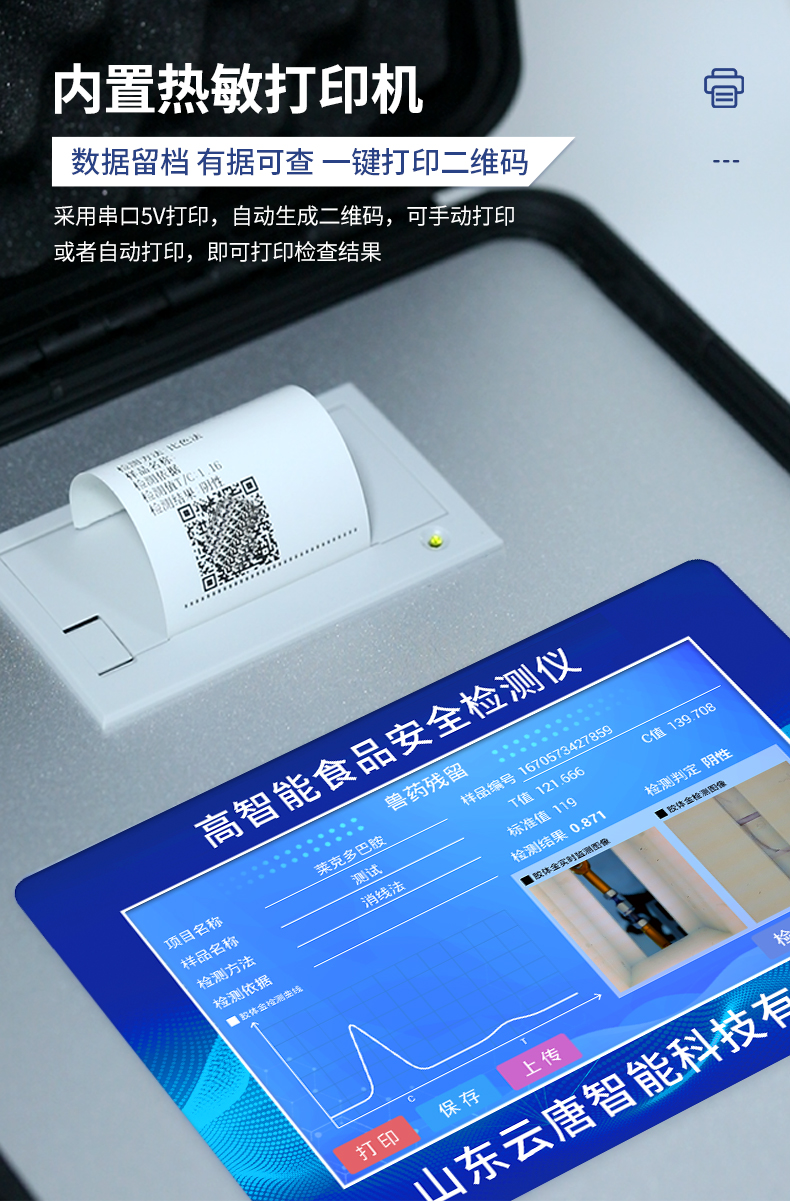 | ★安卓智能操作系統,采用更加**UI交互界面,儀器具有wifi聯網上傳、4G聯網傳輸、GPRS無線遠傳、網線連接功能,快速批量上傳數據。 | ★安卓智能操作系統,采用更加**UI交互界面,儀器具有wifi聯網上傳、4G聯網傳輸、GPRS無線遠傳、網線連接功能,快速批量上傳數據。 | 新一代高速熱敏打印機,檢測完成可自動打印或批量打印檢測報告和二維碼。 | ★儀器帶有監管平臺,數據可局域網和互聯網數據上傳,檢測結果直接傳至食品安全監管平臺。進行區域食品安全監管及大數據分析處理與數據統計,檢測區域食品安全長短期動態,達到食品安全問題預估、預警 | 一體化主機,包含食品安全檢測模塊、多通道農藥殘留檢測模塊、膠體金免疫層析檢測模塊。 | 一體化便攜式快檢設備,滿足現場及流動檢測使用需求,能夠在同一軟件下實現所有檢測項目的檢測,并可通過同一窗口直觀顯示檢測結果。 | 膠體金模塊檢測方式:軌道式自動傳輸掃描,檢測完成后自動退出檢測卡。 | ★儀器內置攝像頭拍照,可顯示金標卡實時圖像,系統自動分析并呈現出CT坐標曲線圖,CT線自動識別,無需手動調整。 | 內置強大的數據庫,具有多品類多種類樣品菜單功能,可靈活選擇檢測樣品,不同的檢測通道可同時檢測不同的樣品項目。也可在儀器上直接編輯錄入樣品名稱、檢測指標、送檢單位等信息并保存進樣品數據庫。 | ★儀器內置操作視頻,點擊視頻模塊即可快速學習,是您身邊的化驗指導專家。 | 樣品處理簡單省力,整體操作快速、安全、便捷。 | ★儀器可配置身份識別功能,通過密碼或刷證件開機,防止非工作人員操作等。 | 高靈敏度,高檢測精度,高重復性精度,掃描式高精度光學傳感器。 | 儀器具有重新校準、鎖定、恢復出廠設置功能。 | 結果判定線可修改,對照值標定值可保存,斷電不丟失數據。 | 兼容市場上所有的膠體金卡,使用耗材不受限制,極大增強用戶使用體驗。 |