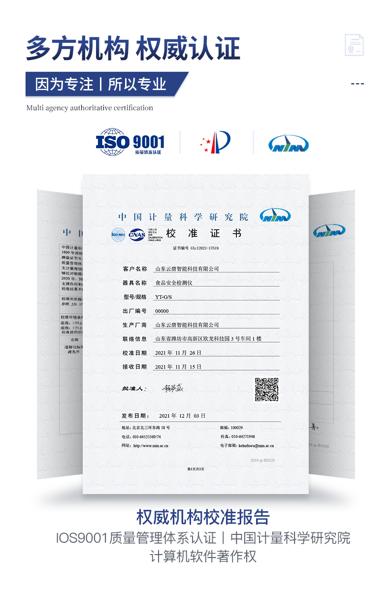 | ★廠家具有高新技術企業認證 | ★儀器具有食品安全轉件著作權 | ★儀器具有國家級計量研究院出具的計量報告 | ★試劑具有國家級計量研究院出具的試劑測試報告 | ★具有ISO9001質量管理體系認證 | ★廠家須有獨立商標知識產權 |