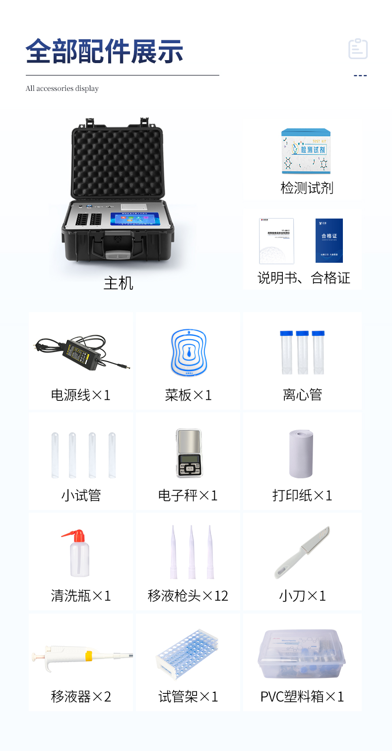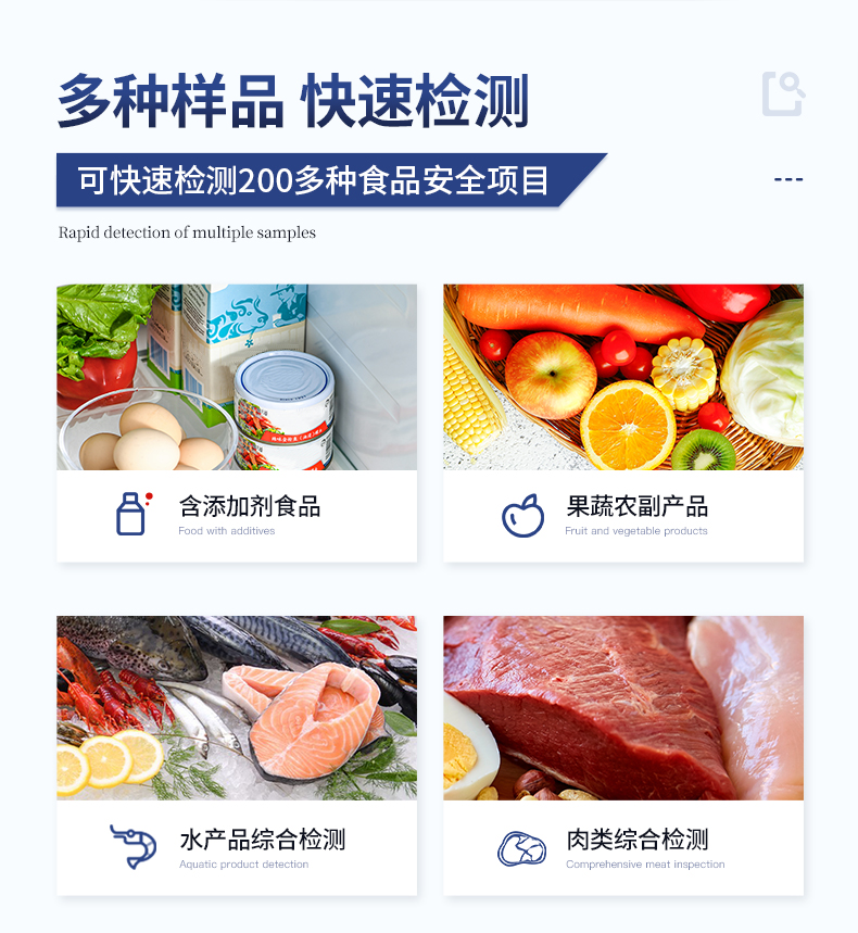 | 食品添加劑:二氧化硫、雙氧水、亞硝酸鹽、硝酸鹽、苯甲酸鈉、山梨酸、糖精鈉、甜蜜素、安賽蜜、硫酸鎂等 | 有毒有害物質:甲醛、吊白塊、硼砂、過氧化苯甲酰、溴酸鉀、羅丹明B、三聚氰胺、蘇丹紅等 | 農藥殘留:酶抑制率法:有機磷氨基甲酸酯類農藥;膠體金法:各種具體農藥檢測 | 病害肉診斷:組胺、揮發性鹽基氮、肉制品酸價、水發產品中組胺 | 重金屬含量:鉛、鎘、鉻、汞、砷、錫、鎳、鋁等;食用油脂檢測:過氧化值、酸價、油脂丙二醛等。 | 食用油脂檢測:::過氧化值、酸價、油脂丙二醛、總多酚等。 | 瘦肉精激素類(獸藥):鹽酸克倫特羅、沙丁胺醇、萊克多巴胺、己烯雌酚、喹乙醇等 | 抗生素殘留類(獸藥):四環素類、硝基呋喃類、磺胺類、β-興奮劑類、沙星類、磺胺類、喹諾酮類,甲砜霉素,氟苯尼考,金剛烷胺、替米考星、慶大霉素、林可霉素、鏈霉素、恩諾沙星、環丙沙星、頭孢啦啶、青霉素、阿莫西林等 | 真菌毒素類:食用油、糧食及飼料中黃曲霉毒素B1、奶中黃曲霉毒素M1、嘔吐毒素、玉米赤霉烯酮、赭曲霉毒素A等 | 水酒飲品分析:乳品及牛奶中蛋白質;酒中甲醇、乙醇、雜醇油;蜂蜜中果糖和葡萄糖、蔗糖、淀粉酶、酸度;水中氰化物、余氯,飲料中維C等 | 調味品成分:食醋的總酸、醬油的總酸、芝麻油純度、谷氨酸鈉、醬油氨基酸態氮、食鹽中亞鐵氰化鉀、食鹽中碘等 | 食用色素類:紅色色素(胭脂紅、莧菜紅、赤蘚紅、誘惑紅)、黃色色素(檸檬黃、日落黃)、藍色色素(亮藍)等 | 動物疫病類:豬藍耳病毒、豬瘟病毒、豬偽狂犬病毒、豬偽狂犬病毒gE蛋白、豬口蹄疫3ABC蛋白、豬口蹄疫病毒IgG、豬細小病毒、雞禽流感等 | 水產品安全類:孔雀石綠、氯霉素、呋喃妥因代謝、呋喃西林代謝、呋喃它酮代謝、呋喃唑酮代謝、氟苯尼考、土霉素、金霉素、甲砜霉素、地西泮等 |