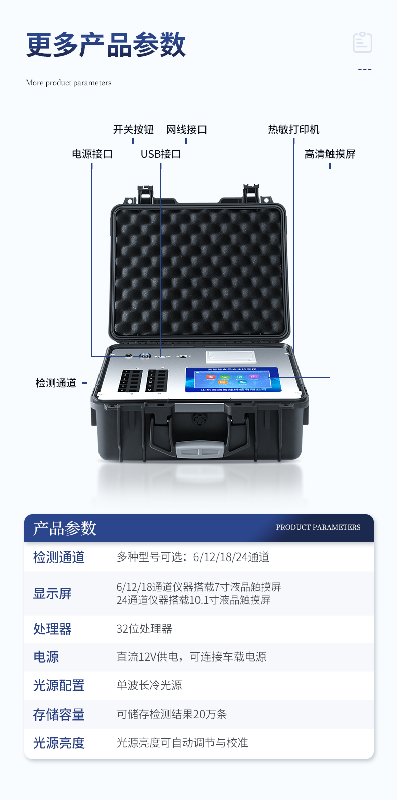 | 1、主控芯片采用ARM Cortex-A7,RK3288/4核處理器,主頻1.88Ghz,運轉速度更快速,穩定性更強。 | 2、顯示方式:7英寸液晶觸摸屏顯示,人性化中文操作界面,讀數直觀、簡單。 | 3、交直流兩用,直流12V供電,可連接車載電源,可配6ah大容量充電鋰電池,方便戶外流動測試。 | ★4、四波長冷光源,18個檢測通道,每個通道均配置410、520、590、630nm波長光源,標配**的光路切換裝置,專業光路切換功能可實現*多64波長,并且所有檢測項目可實現所有通道同時檢測。 | 5、智能恒流穩壓,光強自動調節與校準,長時間連續工作光源無溫漂現象。 | ★6、內置新國家限量標準,與所測結果進行現場比對,并持續更新標準。 | 7、不間斷進樣,連續檢測 | 8、樣本編號自動累加。 | 9、數據無線上傳平臺,并可從平臺導出為Excel表格。 | 10、檢測結果存儲容量20萬條。 | ★11、同時支持U盤拷貝,標準USB接口,免驅動插拔。 | 12、檢測項目可擴充,固件可升級 | 13、儀器尺寸:43×35×19cm, 主機凈重:5.2kg | 14、儀器包裝尺寸:510*390*375mm 包裝重量:8.6kg |