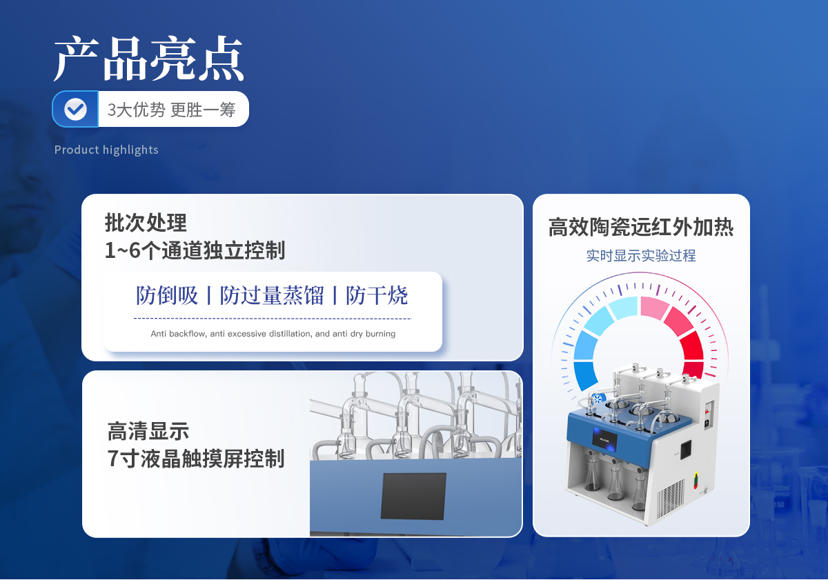 智能一體化蒸餾儀采用智能模塊化設計:方法自定義設置保存/讀取、開機自動調取使用,冷凝單元特殊定制蛇形冷凝管、智能終點控制防過量蒸餾、防倒吸保護,防干燒保護、實現了智能操作簡單、自動蒸餾、美觀實用、節能降耗、節省人工的同時為用戶做樣提**率節約人員成本開銷。
